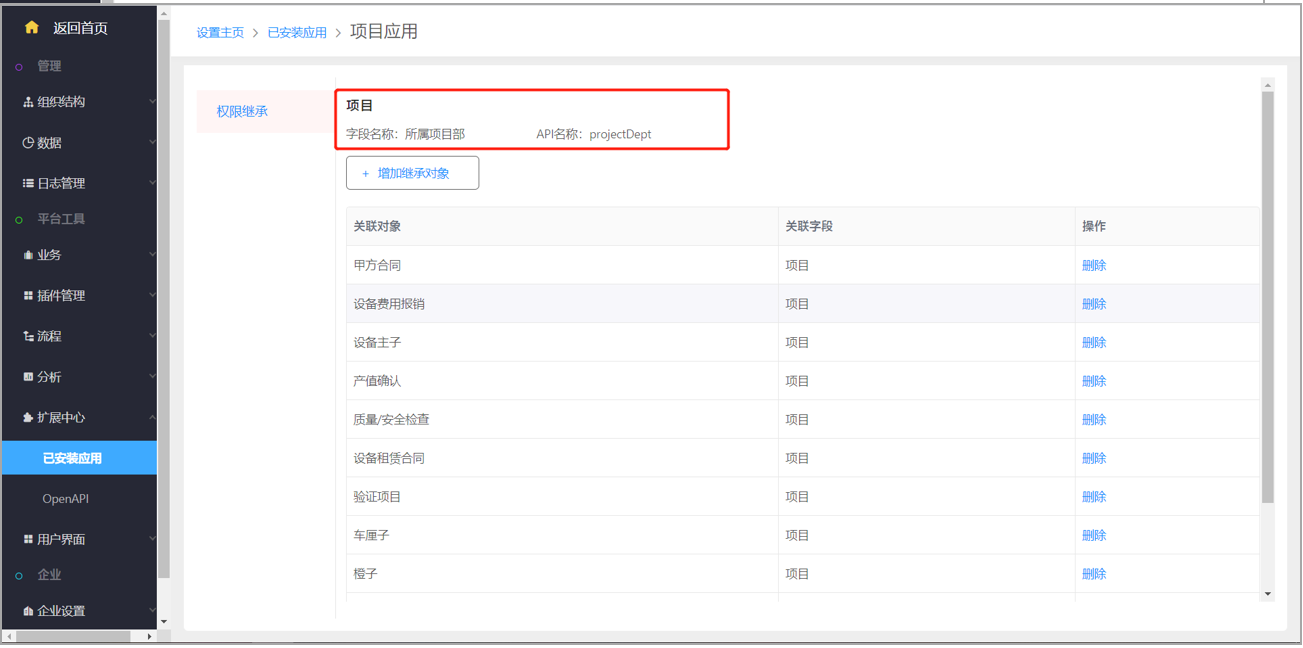 為實(shí)現(xiàn)項(xiàng)目及其相關(guān)對(duì)象的矩陣型權(quán)限控制,以及相關(guān)對(duì)象與項(xiàng)目權(quán)限的一致性,v2101 在權(quán)限管理上進(jìn)一步推出了項(xiàng)目多維度和權(quán)限繼承能力,擴(kuò)展中心新增項(xiàng)目應(yīng)用。此應(yīng)用為項(xiàng)目及相關(guān)對(duì)象插入部門(mén)字段,結(jié)合項(xiàng)目型組織,實(shí)現(xiàn)對(duì)象雙部門(mén)結(jié)構(gòu),雙權(quán)限體系,保證項(xiàng)目下相關(guān)對(duì)象的數(shù)據(jù),在項(xiàng)目部門(mén)維度下,與項(xiàng)目保持一致。如果員工A是項(xiàng)目1的成員就可以通過(guò)此功能快速設(shè)置獲得項(xiàng)目1下所有對(duì)象的相關(guān)信息而不需要通過(guò)添加跟進(jìn)人的形式進(jìn)行權(quán)限設(shè)置。