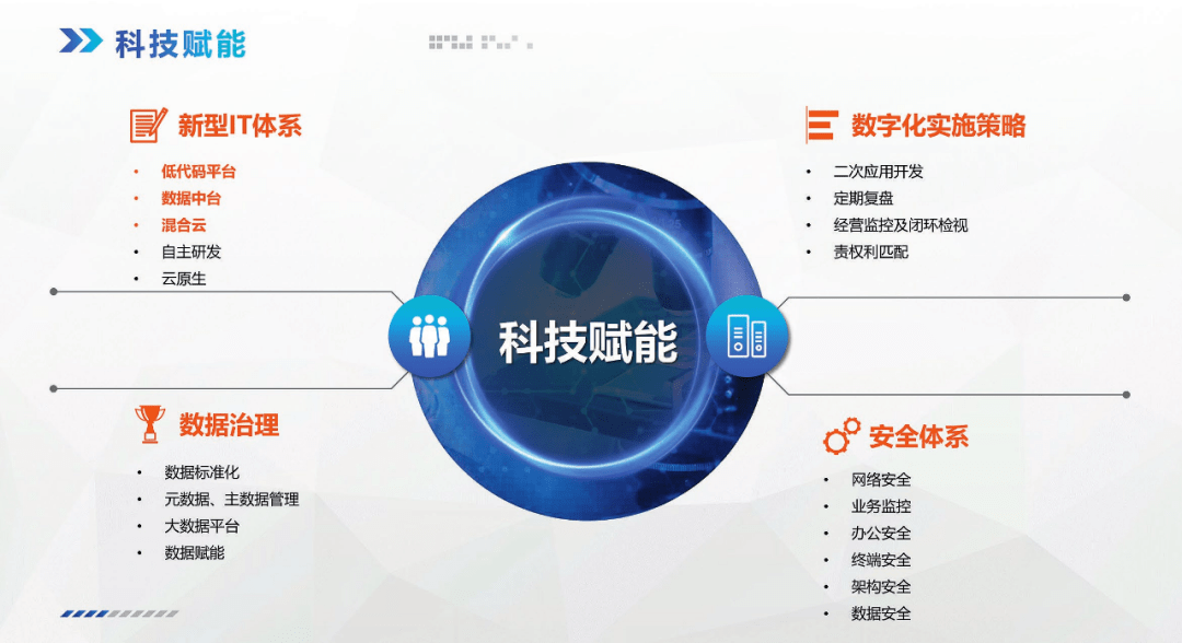 要實現科技賦能,首先要考慮科技賦能的基礎設施,這有四個方面:一是新型IT體系、二是數據治理、三是安全體系、四是數字化實施策略(圖11)。
