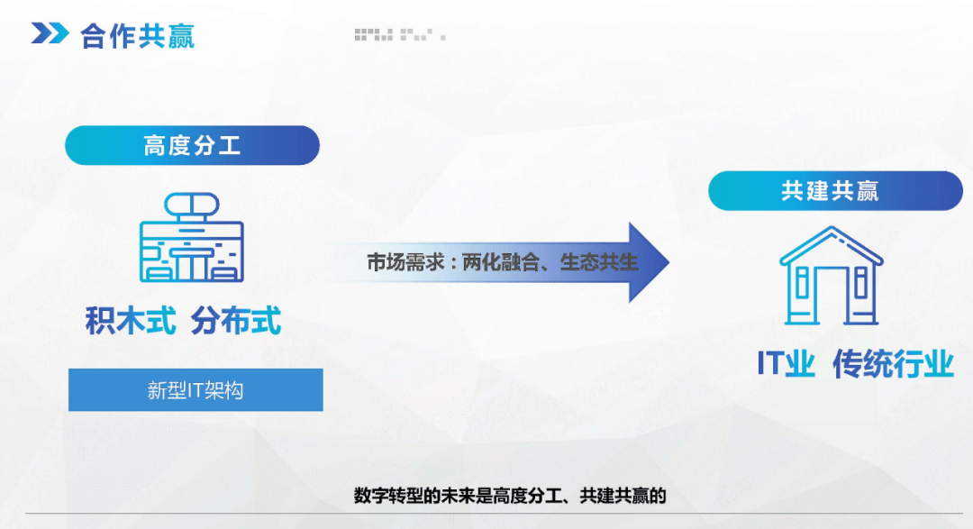 數字化轉型的未來是高度分工、共建共贏的,在新型IT架構體系下,未來的系統可以是積木式、分布式的,高性能、高響應、低成本、低門檻將是科學技術發展的方向。