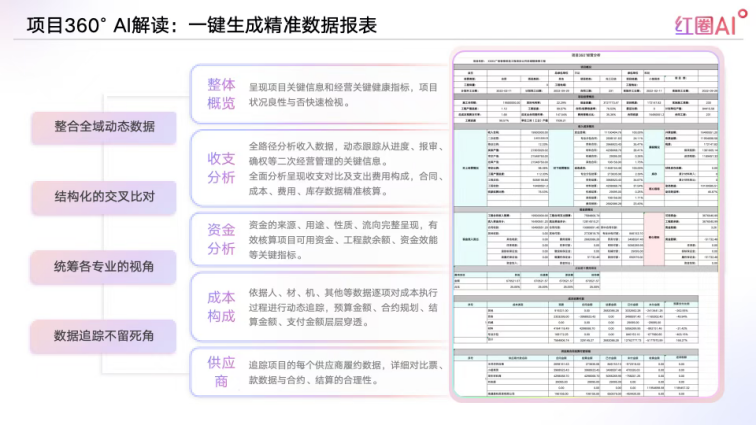 比如項(xiàng)目360°AI解讀,你想了解某個(gè)項(xiàng)目的情況,不用再讓下屬寫(xiě)報(bào)告——點(diǎn)一下按鈕,系統(tǒng)自動(dòng)生成一份“效益體檢報(bào)告”:資金夠不夠用?成本有沒(méi)有超支?進(jìn)度是不是滯后?甚至能告訴你“成本超支是因?yàn)槟撤职填l繁變更合同”,連優(yōu)化建議都給出來(lái)。相當(dāng)于給你配了個(gè)“智能參謀”,不用自己扒數(shù)據(jù),問(wèn)題根因、解決方向全清楚。
