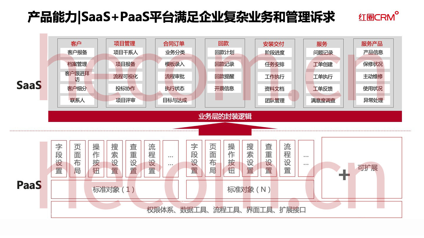 紅圈PaaS是由紅圈研發團隊自主研發,通過組件化方式,為企業提供定制化服務的平臺。通過靈活配置,深入領域,精準匹配企業的業務特性,貫穿企業的行為、過程與結果,為企業管理提供有效的個性化解決方案。